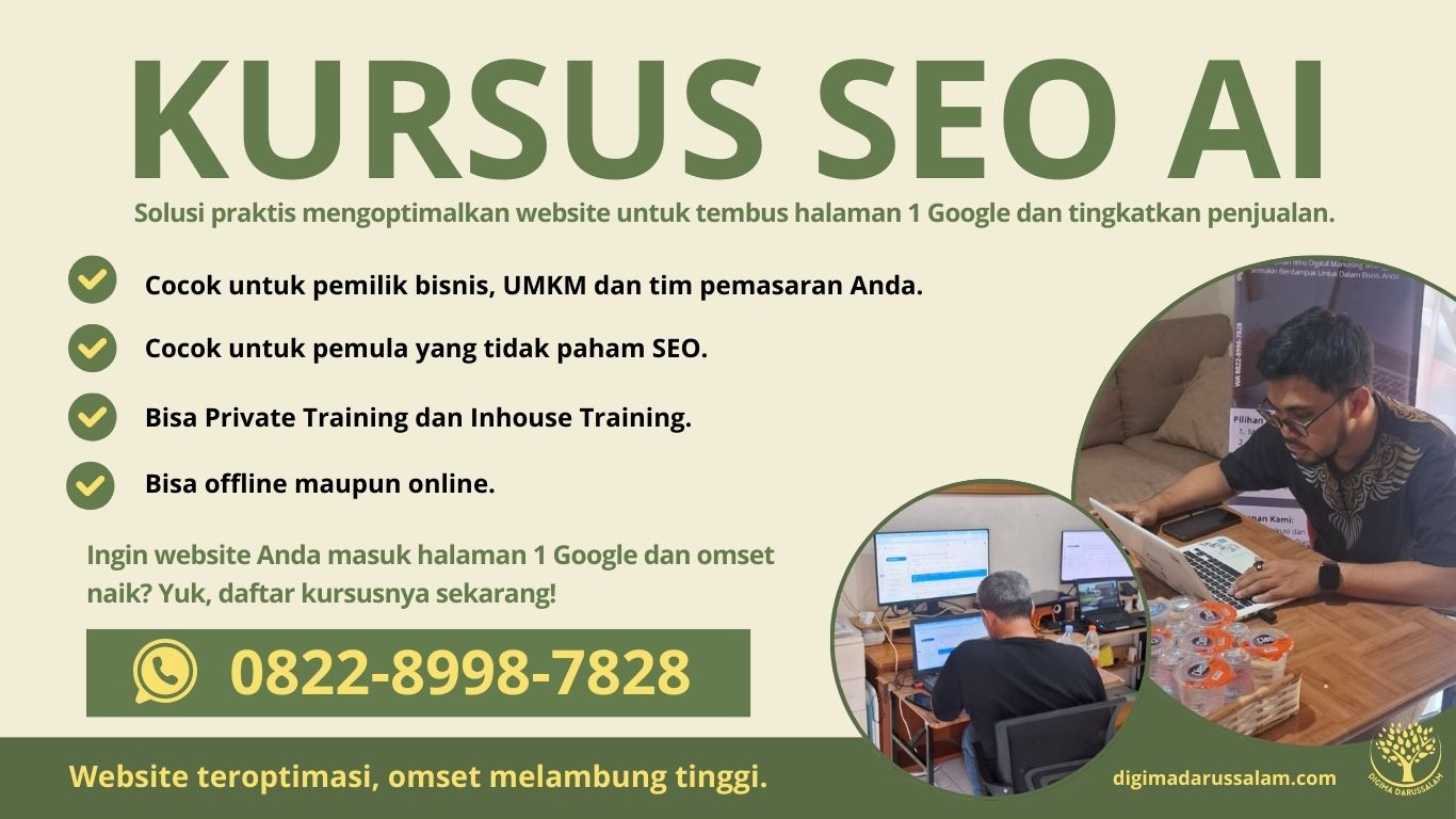 Kursus SEO AI kini menjadi solusi terbaik bagi siapa pun yang ingin menguasai dunia digital dengan lebih efektif dan cepat. Di tengah perkembangan algoritma Google yang terus berubah, kebutuhan untuk belajar SEO dengan AI bukan lagi pilihan, melainkan keharusan. Digima Darussalam hadir menawarkan teknik SEO terbaru 2025 yang praktis, mudah dipahami, dan dapat langsung diaplikasikan untuk membantu bisnis Anda masuk ke halaman satu Google.